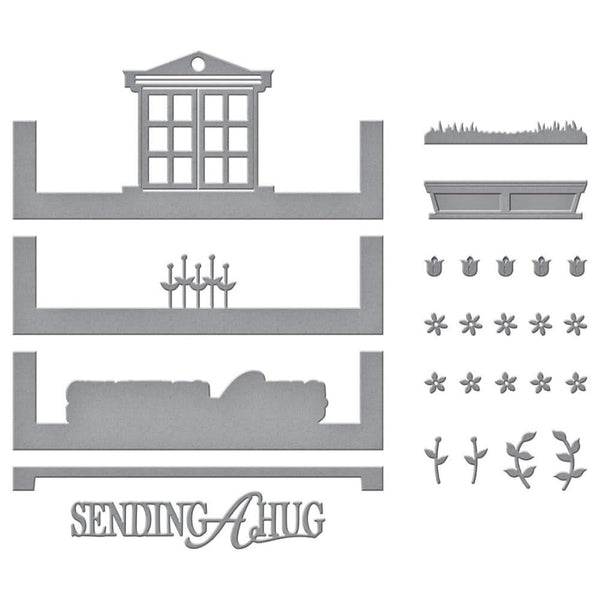 Spellbinders Etched Dies - Picture Perfect Window Scene - Picture Perfect Window Scene Etched Dies is a part of the Make a Scene Collection by Becca Feeken of Amazing Paper Grace. Open a new window with this set of 13 thin metal dies! The Top and Bottom Insert Frame help attach the scene to the card base. The scene dies are a window that actually opens, a row of five flower stems, and a sentiment with its outline. To accent, there are three different types of blooms, vines, stems, grass, and window box. Designed to be used with S6-165 Make a Scene Card Base Etched Dies Set (sold separately).