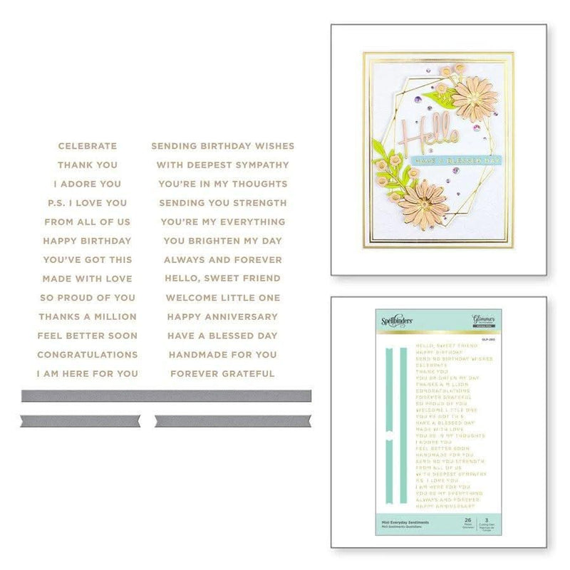 Spellbinders Glimmer Hot Foil Plate and Die - Mini Everyday Sentiments - Mini Everyday Sentiments Glimmer Hot Foil Plate and Die Set is part of the Simply Perfect Collection. There are 26 sentiment plates that cover many different occasions from friendship to celebration to love. Also included are three different widths of sentiment strips dies to cut from.