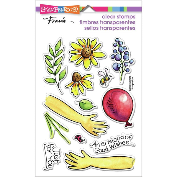 Stampendous Perfectly Clear Stamps - Hands Hold - Send out an armload of wishes with a handcrafted card using the Hands Hold Clear Photopolymer Stamps by Fran Seiford for Stampendous. The package contains 13 clear stamps on a 5.5" x 4" storage sheet. The stamps can be used with an acrylic block and your favourite inks (sold separately). The stamps are in the shapes of flowers, a balloon, arms, and more. Largest: 2.75" x 1", Smallest: 0.5" x 0.18"