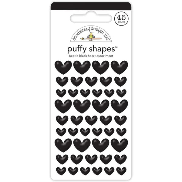 Doodlebug Puffy Stickers Beetle Black Heart - 7720 - This package of 45 Puffy Shapes Stickers, Beetle Black Heart, is part of the Monochromatic Collection from Doodlebug Design. These hearts are self-adhesive stickers and there are three sizes of hearts. These puffy shape stickers can be added to cards, scrapbook pages, tags, journals, planners, art journals, and other paper crafting, home decor, and mixed media projects.