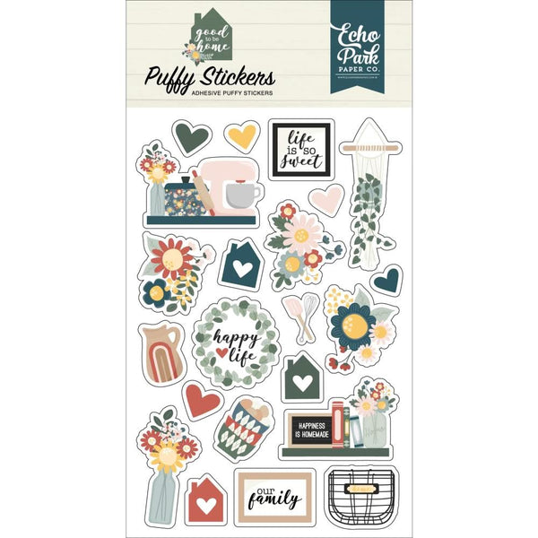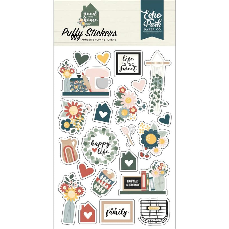 Echo Park Puffy Stickers Good To Be Home - This package of Puffy Stickers is part of the Good To Be Home Collection from Echo Park. This package includes a wall hanging, kitchen utensils, kitchen signs, flowers, hearts, and a pitcher. These stickers can be added to cards, scrapbook pages, tags, journals, and other paper crafting projects.