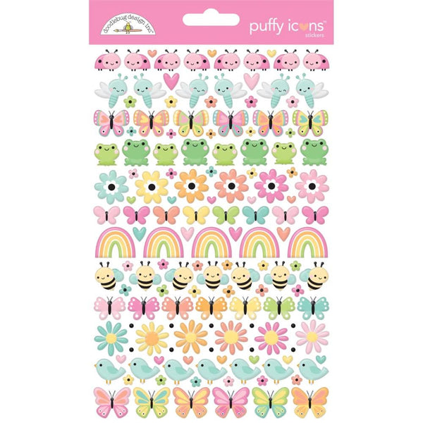 Doodlebug Puffy Stickers Icons, Butterfly Kisses - Elevate your crafts with Doodlebug Butterfly Kisses Puffy Icons Stickers. These charming Spring icons, including ladybugs, butterflies, and more, add a playful touch to your decorations. The unique puffy texture adds dimension to your projects. Each set is approximately 5x7 inches, perfect for adding a fun and exclusive touch.