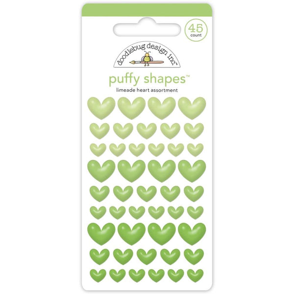 Doodlebug Puffy Stickers Limeade Heart - This package of 45 Puffy Shapes Stickers, Limeade Heart, is part of the Monochromatic Collection from Doodlebug Design. These hearts are self-adhesive stickers, there are three color variations within the set, and there are three sizes of hearts. These puffy shape stickers can be added to cards, scrapbook pages, tags, journals, planners, art journals, and other paper crafting, home decor, and mixed media projects.
