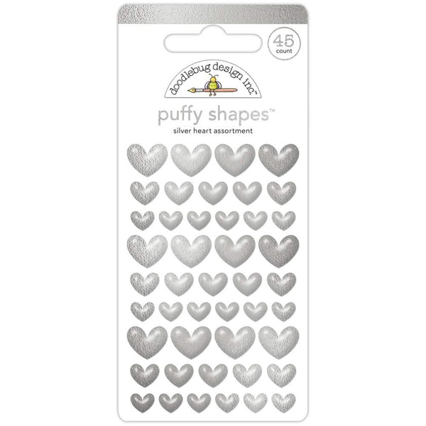 Doodlebug Puffy Stickers Silver Heart, Hello Again - This package of Puffy Shapes, Silver Heart, is part of the Monochromatic Collection from Doodlebug Design. There are 45 hearts in three sizes, you get 12 large hearts, 15 medium hearts, and 18 small hearts. These hearts can be used on cards, scrapbook pages, tags, journals, and other paper crafting and mixed media projects.