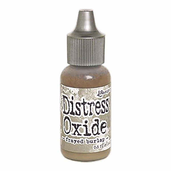 Tim Holtz Distress Oxide Reinkers - Frayed Burlap. This water-reactive dye and pigment ink fusion creates an oxidised effect when sprayed with water. Use to re-ink Distress Oxide Ink Pads (sold separately). Available in a variety of colours, each sold separately. This package contains Tim Holtz Distress Oxides Reinker, 0.5 ounces. Conforms to ASTM D 4236.