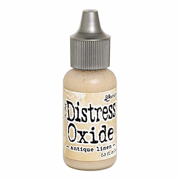 Tim Holtz Distress Oxide Reinkers - Antique Linen. This water-reactive dye and pigment ink fusion creates an oxidised effect when sprayed with water. Use to re-ink Distress Oxide Ink Pads (sold separately). Available in a variety of colours, each sold separately. This package contains Tim Holtz Distress Oxides Reinker, 0.5 ounces. Conforms to ASTM D 4236.
