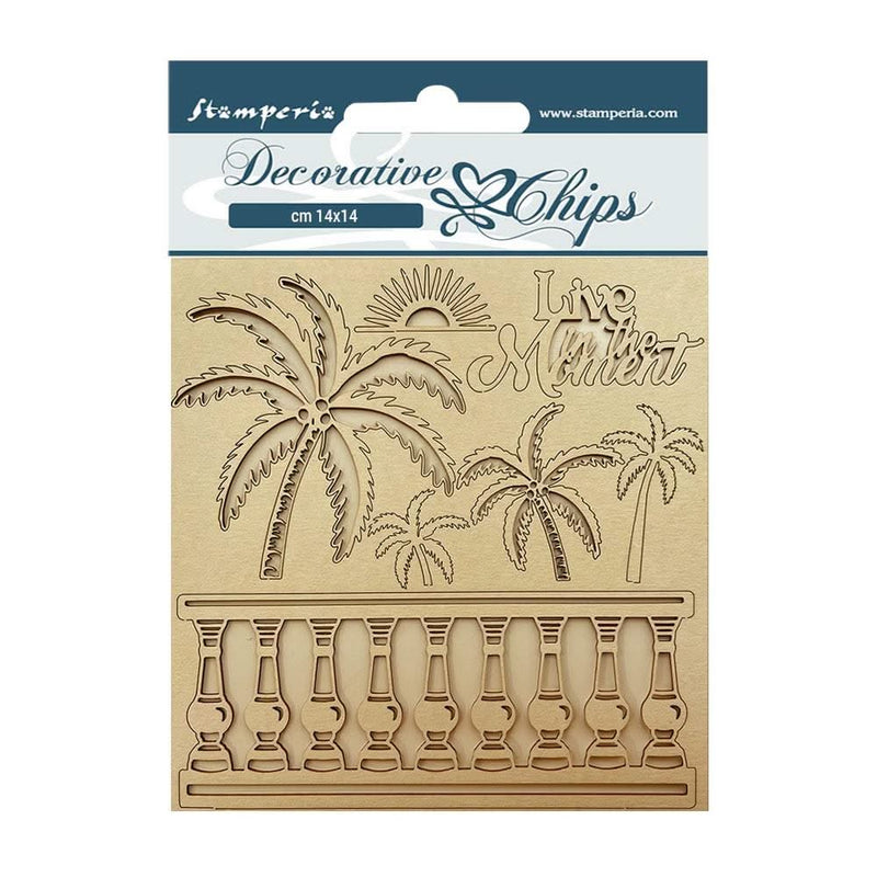 Stamperia Decorative Chips 5.5"X5.5" (14cm x 14cm) - Blue Dream Palms. Embellishments can add whimsy, dimension, colour and style to greeting cards, scrapbook pages, altered art, mixed media and more. These decorative chips can be stained, inked, painted or used as is.