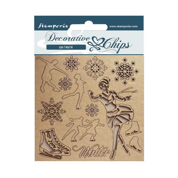 Stamperia Decorative Chips 5.5"X5.5" (14cm x 14cm) - Sweet Winter Ice Skater - While you need the perfect paper to start your project, you also need the perfect embellishment to finish it! Embellishments can add whimsy, dimension, colour and style to greeting cards, scrapbook pages, altered art, mixed media and more. These decorative chips can be stained, inked, painted or use as is!