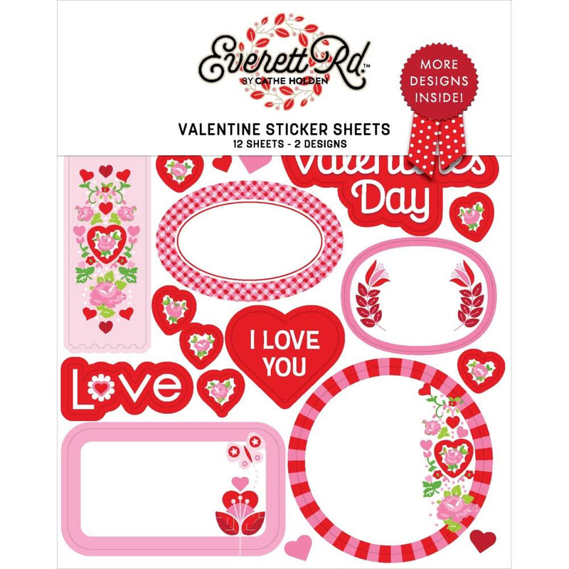Everett Rd. Valentine Sticker Sheets 2 designs, 12 sheets - Get the feeling Love is in the air with Cathe Holden's Everette Road Collection of Valentine stickers. This 12 Sheet sticker pack includes six sheets of each of two designs. One design features butterflies, envelopes and more. The other has flower, hearts, circles and much more!. Whether you're creating handmade cards, scrapbook pages, or other paper crafts, this sticker pack is perfect for adding a touch of spring flair to your projects.