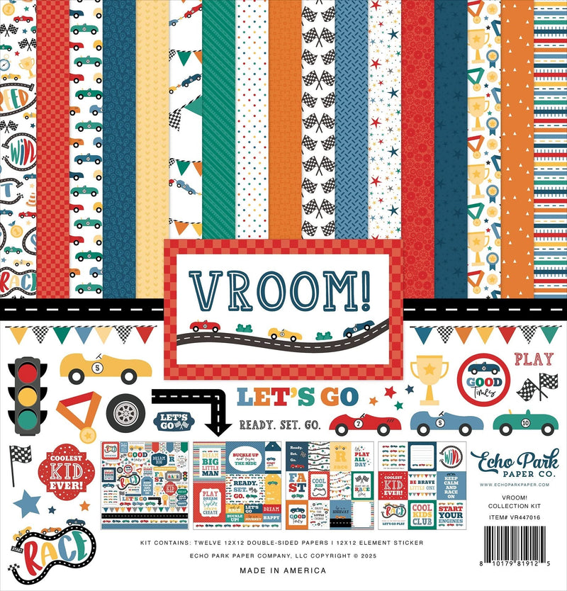 Echo Park Collection Kit 12"X12" Vroom! - Start your project off right with the perfect paper for scrapbook pages, greeting cards, bookmarks, gift cards, mixed media and so much more! This kit contains twelve double-sided papers, and one 12x12 element sticker sheet.
