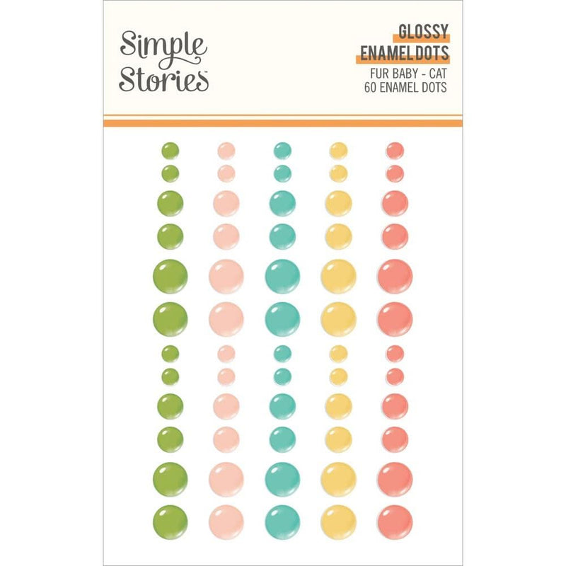 Simple Stories Fur Baby Cat Enamel Dots 60/Pkg GLOSSY - While you need the perfect paper to start your project, you also need the perfect embellishment to finish your project! Embellishments can add whimsy, dimension, colour and style to greeting cards, scrapbook pages, altered art, mixed media and more. This package contains Simple Stories Colour Vibe Enamel Dots Embellishments - Bolds, 60 pieces - 5 colours 3 sizes, 4 of each size.