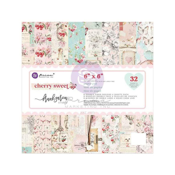 Prima Marketing Double-Sided Paper Pad 6"X6" 24/Pkg Cherry Sweet By Frank Garcia - The Cherry Sweet collection by Frank Garcia® presents a sophisticated blend of charming animals, vintage floral motifs, and a gentle pink colour scheme that creates a dreamy, enchanting feel. Perfect for junk journals, mini albums, scrapbooking, and card making, this 6 x 6 inch paper pad contains 32 sheets featuring 8 double-sided designs, with four sheets of each. Crafted with care for Prima Marketing, this collection adds an elegant dimension to your creative endeavors. The imagery includes hedgehogs, puppies, and other endearing creatures, alongside cherries, flowers, hot air balloons, and butterflies in shades of pink, red, blue, and aqua.