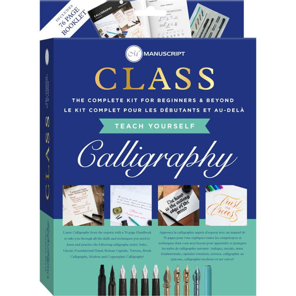 Manuscript Class Calligraphy Set 76 Pages - Teach Yourself Calligraphy with the Manuscript Class Calligraphy Kit! This set has been developed to be the complete kit to get started in Calligraphy. Producedin partnership with world renowned artists and calligraphers, this kit is the perfect set to aid you in your creative journey. Our Calligraphy Kit includes a comprehensive 76 page handbook developed in conjunction with world renowned calligraphers. It guides you through the complete journey from the tools needed, hints and tips on getting started and all the key drills required to practice calligraphy. This handbook contains dedicated teaching sections to learn the following scripts: Italic, Uncial, Foundational, Textura, Roman Capitals, Brush Calligraphy, Modern Calligraphy and Copperplate Script. Get started straight away with a selection of specially selected pens ideal for practicing each style from the hand book.