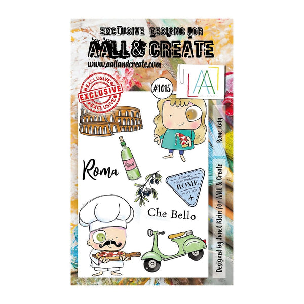 Aall & Create - Clear Stamp Set #1015 - Rome Italy. Aall & Create stamps are made from high-quality, clear photopolymer. These superior-quality clear stamps are deeply etched to provide a crisp image and, as photopolymer stamps are self-clinging, they adhere well to any clear acrylic block (Sold Separately). Designed by Janet Klein. The stamp set includes 9 stamps. Size: A6 (10cm x 15cm).