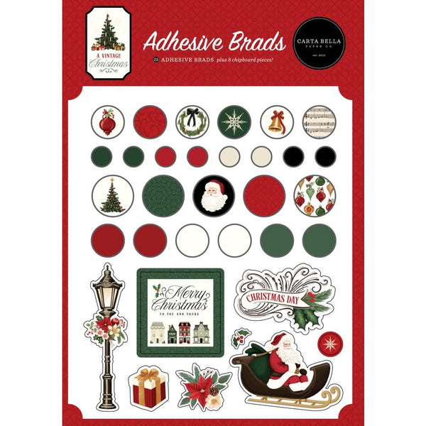 Carta Bella Decorative Brads A Vintage Christmas - While you need the perfect paper to start your project, you also need the perfect embellishment to finish your project! Embellishments can add whimsy, dimension, colour and style to greeting cards, scrapbook pages, altered art, mixed media and more. This package contains Carta Bella At Home Adhesive Brads.