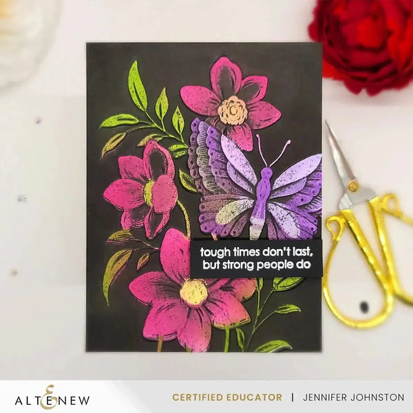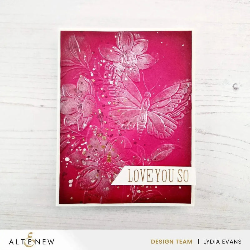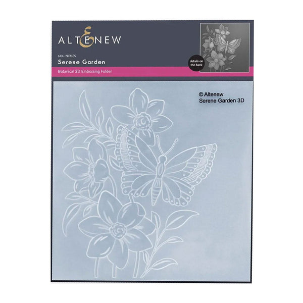 Altenew Serene Garden Botanical 3D Embossing Folder. The Serene Garden 3D Embossing Folder features a delicate butterfly resting on a flower, perfect for colouring and creativity. Pair it with a simple background stencil and an elaborate word die for stunning results! Includes one 6"x 6" (15cm x 15cm) embossing folder.