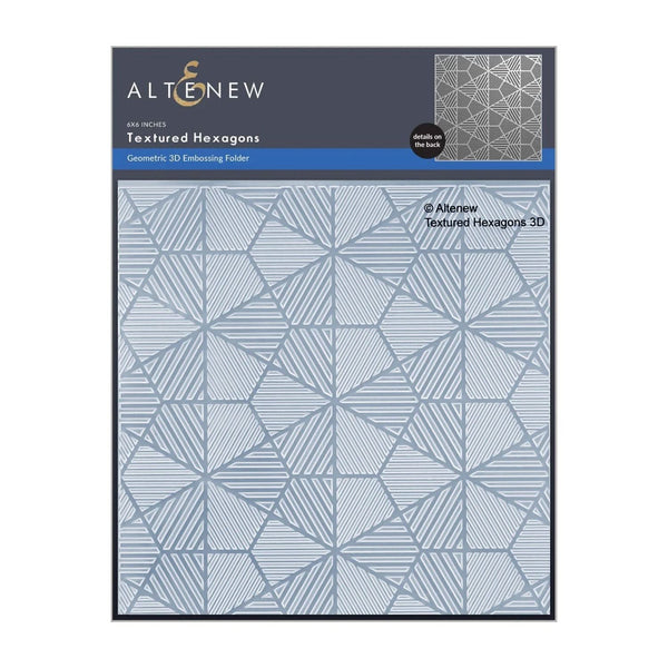 Altenew Textured Hexagons 3D Embossing Folder. Textured Hexagons 3D Embossing Folder showcases hexagons filled with alternating thick and thin striped diamonds, allowing you to elevate your crafting projects with impactful backgrounds for cards, textured die-cuts, and beyond! Elevate your handmade cards and other DIY crafts with this must-have embossing folder – where creativity meets nature in every intricate detail! Take your projects to a new dimension with our 3D Embossing Folders. Instead of achieving merely two levels of embossed texture, this folder will produce three-dimensional designs to enhance your creations. Simply run through your die-cutting machine (sold separately) following the manufacturer's instructions for 3D embossing folders, and you're all set! Includes one 6"x 6" (15cm x 15cm) embossing folder.