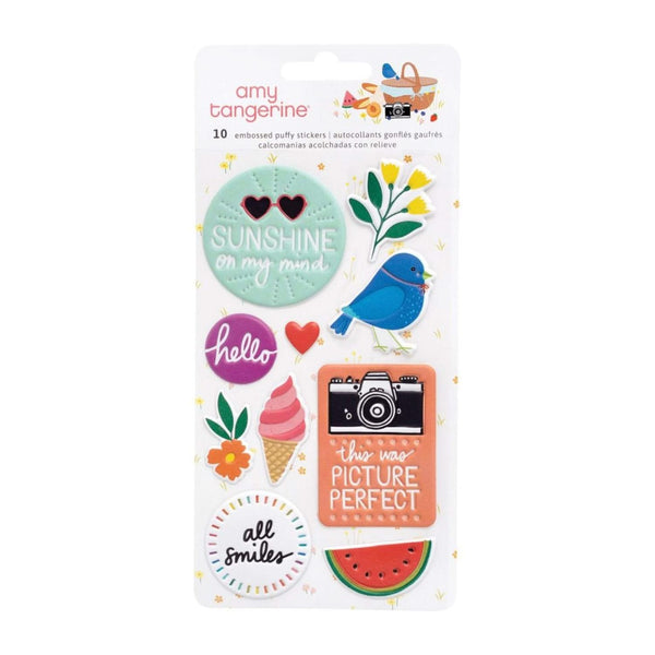 American Crafts Amy Tan Picnic In The Park - Embossed Puffy Stickers 10 pack - Icons. Make your pages pop with these unique embossed stickers! Ideal for scrapbook pages, cards and DIY projects! This package contains ten assorted embossed puffy stickers on one 3.5x6.5 inch backing sheet.