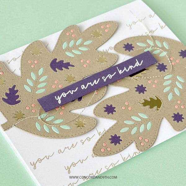 Concord & 9th Clear Stamps 6"x 8" - Triple Step Autumn Leaf - This unique Triple Step Autumn Leaf stamp set is from Concord & 9th. The set includes 18 clear photopolymer stamps. These stamps adhere to acrylic blocks and can be used with your favourite inks, markers, embossing powders, and other crafting mediums (all sold separately). The 3 large foliage stamps can be layered together to create detailed autumn leaves for your fall crafting projects. Each of the stamps has an arrow at the top and there is an image on the back of the package, both to help with the correct lining up of the layers. This set also includes 6 sentiments that can be used on a variety of cards and many autumn leaves and other small stamps to enhance your stamping. This stamp set has a coordinating die set (C11178, sold separately) to make crafting with this set even easier.