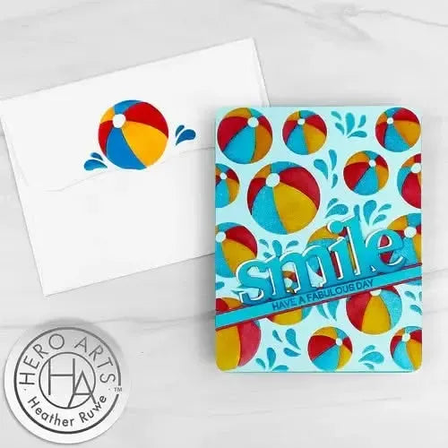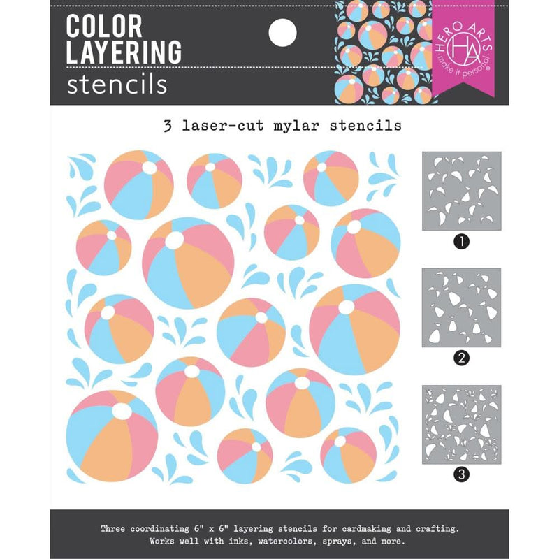 Hero Arts Colour Layering Stencil Set 6"X6" Beach Ball - Bring the fun of summer to your projects with the Beach Ball Colouring Layering Stencils from Hero Arts! This set includes three 6" x 6" stencils that layer to create a vibrant background of beach balls and water splashes, perfect for all your summertime crafting needs. Made from thick frosted mylar with precise laser-cut images, these stencils work beautifully with your favourite inks, markers, paints, pastes, sprays, mists, and other crafting mediums (all sold separately). Ideal for adding a splash of summer to cards, scrapbook pages, tags, journals, and other paper crafting projects, these stencils will inspire endless creativity. Dive into summer fun and let your imagination soar with this versatile stencil set!