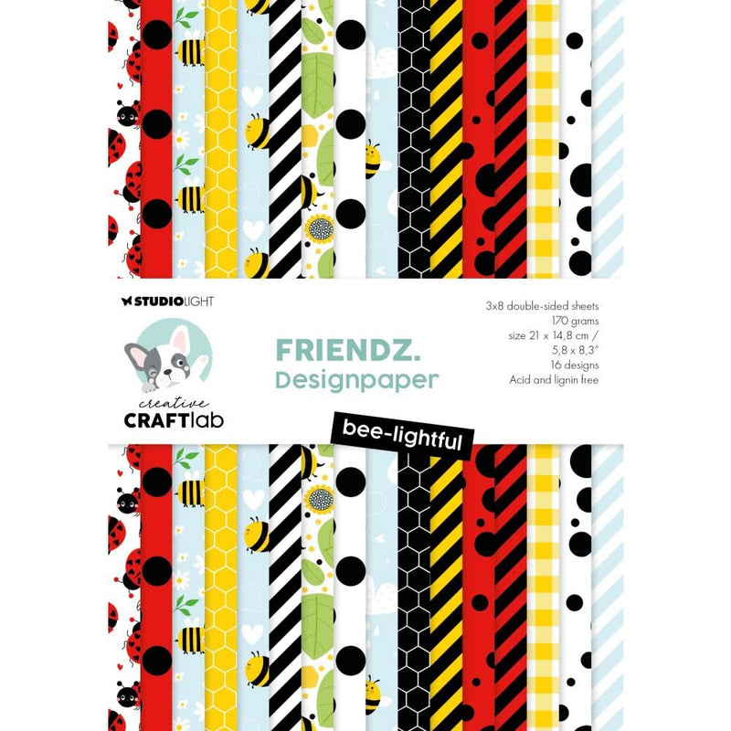 Studio Light Creative Craftlab Friendz Designer Paper pad 8.25"X 5.83" Bee-lightful - Studio Light Designer Paper pad contains 24 sheets. Printed on one side to complement a collection, but can also be used on its own. The paper is 170gsm cardboard and acid-free. It can be used for Scrapbooking, Card Making, and other projects.