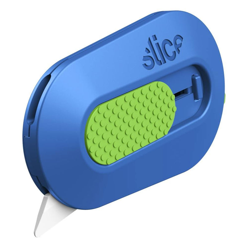 Slice Mini Cutter - Blue - The Slice Manual Mini Cutter combines safety and convenience in a small but powerful tool. Its the perfect size and weight for using on-the-go and has an in-built magnet so you can keep it on the fridge (or other metallic surfaces) for easy access. This versatile compact cutter is great for opening boxes, parcels, clamshells and shrink-wrap and has a finger-friendly blade to keep you and the contents of your packages safe. It has a reinforced handle for durability and is suitable for left- and right-handed users. Slice remains the first choice for safety and effectiveness in industrial settings and is now recognized as the leading safety cutter in homes. From its daily use in shipping warehouses to opening online orders at home, the Manual Mini Cutter makes people and places safer. Available in many fun, bright colours!