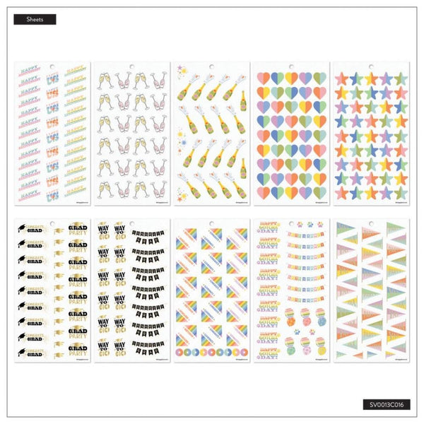 Happy Planner Classic Sticker Value Pack 30/Pkg Celebrate - This Celebrations sticker book was made for Classic size Happy Planners or notebooks and planning your next big party! Included are rainbow-inspired stickers for birthdays, holiday parties, or even pet adoptions day. Make planning something to celebrate as well as you get ready for big occasions. Use the decorative accents for a little extra flair as you prep for the main event! 30 sheet sticker book with 822 Celebrations themed stickers. Fitted for Classic size Happy Planner items. Matte paper stickers and decorative stickers to add to your monthly calendars and weekly spreads. Features bright, colourful stickers for all kinds of occasions to celebrate.