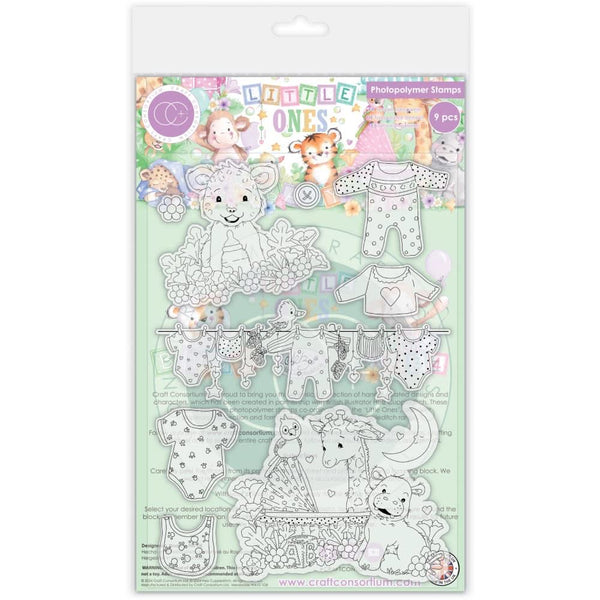 Craft Consortium Little Ones Photopolymer Stamp Set Clothes - Craft Consortium Little Ones Clothes Clear Stamps is a premium 6x8 inch clear photopolymer stamp set featuring 9 coordinating designs. This delightful set includes charming images such as a baby cheetah with a bottle nestled in a patch of flowers, a clothesline adorned with drying baby clothing and a cute bird perched atop, as well as a scene featuring a bird, giraffe, and hippo peering into a bassinette, along with various other baby clothing items. Each stamp comes with protective acetate film printed with outline references for precise cutting and easy application.