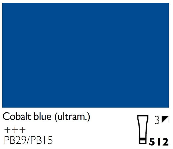 Cobra Artist Water Mixable Oil Colour - 512 - Cobalt Blue (Ultramarine) 40ml. Cobra Water Mixable Oil Colours provide all the features of traditional oil colour, but without the need to use strong solvents. Painting with Cobra is the same as painting with traditional oil paint - the paint can be applied using all the usual oil paint techniques and there are no visible changes during the drying process. The colour, as well as the brush stroke or applied texture, retains its full colour and brightness after the paint has dried. Suitable for all oil painting techniques and for application with brushes, painting knives, rollers, sponges and more. There’s no need for harsh solvents to clean your used brushes - just use soap and warm water to quickly remove the paint. The complete range consists of 70 transparent, semi transparent and semi opaque colours, each sold separately. 40ml tubes.