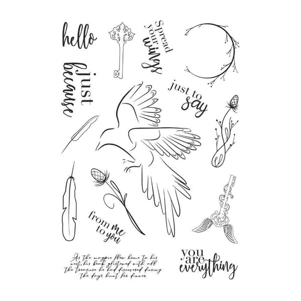Creative Expressions A5 Clear Stamp Set By Bonnita Moaby - Spread Your Wings. Even from a young age, Bonnita Moaby remembers spending hours colouring in or drawing. This carried on into her school years and college. After training and working as a graphic designer, Bonnita has moved on to publish colouring books and has been awarded many prizes for her artwork. She has now turned her hand to designing stamps for us. These clear sets are fun designs; the roots of them can be seen in Bonnita’s graphic beginnings. This fun sketchy bird is accompanied by foliage and seven greeting stamps. Ready to mount on an acrylic block, the stamps can be used with ink pads, paint, or used with pigment ink and embossing powder (each sold separately). They are suitable for paper, fabric, or any other surface, depending on the ink choice. Size: 15.2 x 20.3 cm size – 15 piece stamp set.