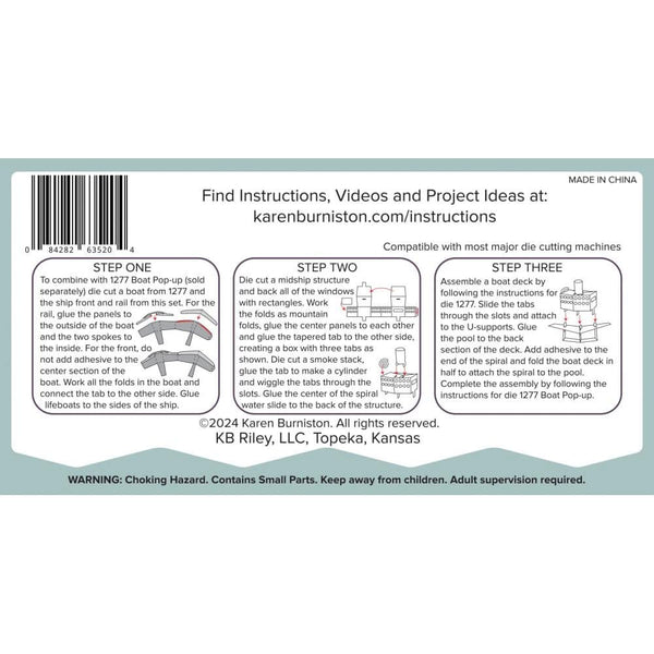 Karen Burniston Dies Cruise Ship Add-ons - The Cruise Ship Add-Ons Dies by Karen Burniston are designed to transform the Boat Pop-Up Dies 1277 into a grand cruise ship. This 10-piece set includes taller sidewalls, a centre section with windows, an anchor, a funnel, and other nautical details, giving your boat a classic ocean liner look.