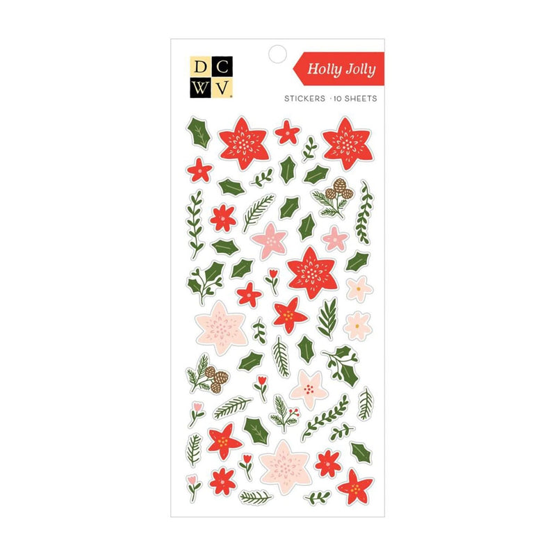 DCWV Christmas Stickers 10 Sheets - Holly Jolly, W/Gold Foil. This package of stickers with gold foil accents is part of the Christmas Carol Collection from Die Cuts with a View. This package includes 10 sheets of stickers. There are 5 pages of clear stickers and 5 pages of paper stickers. Each page of stickers is different, giving you a wide variety of sticker designs. These stickers can be added to your scrapbook pages, cards, tags, bookmarks, journals, planners, and other paper crafting projects.