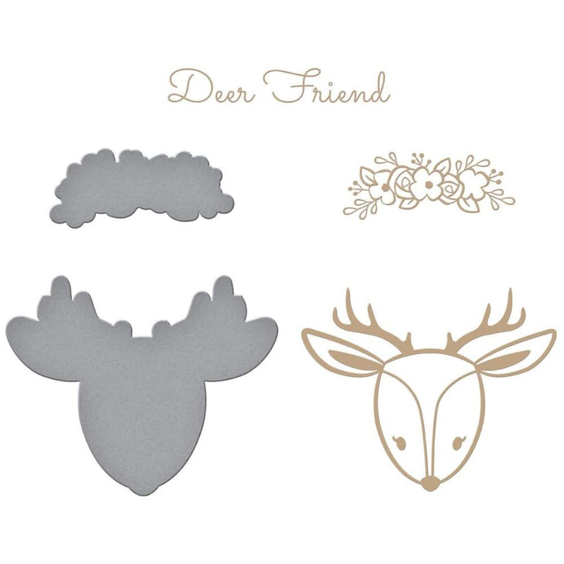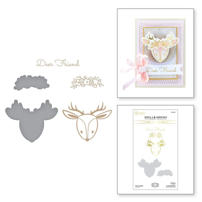 Spellbinders Glimmer Hot Foil Plate & Die By Becca Feeken - Deer Friend - Deer Friend Glimmer Hot Foil Plate & Die Set is part of the Sweet Cardlets II Collection by Becca Feeken of Amazing Paper Grace. The set of three plates and two thin metal dies creates a sweet deer with a crown of flowers on its head ensemble. Both has its matching die to cut and pop up for dimension on a project. Play on words of Deer Friend is foiled for a fun flair!