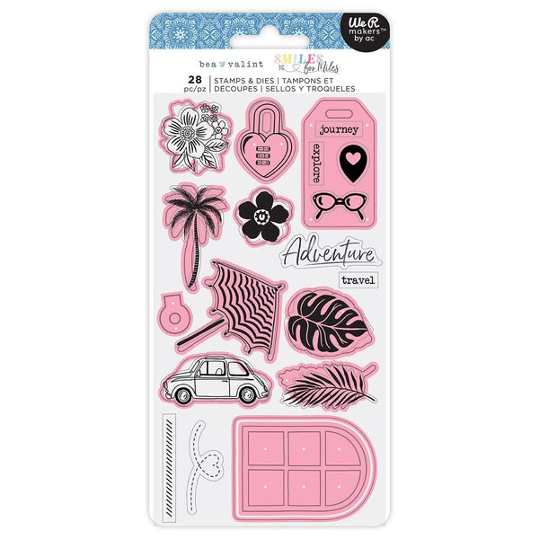 Bea Valint - Smiles For Miles Collection - Clear Photopolymer Stamps and Dies - Capture the fun, joy, and sunshine of your favorite adventures with the Smiles For Miles Collection from Bea Valint and We R Makers. Whether you're scrapbooking beach days, card making for travel lovers, or adding flair to your journaling, this playful collection brings your stories to life with bright colors, fun shapes, and vacation-inspired vibes. These stamps are perfect for every card maker and papercrafter wanting to infuse their projects with a little wanderlust.