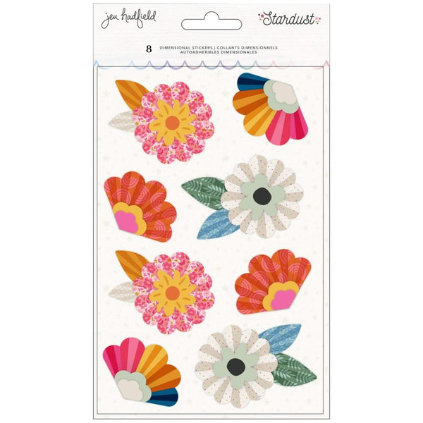 American Crafts Jen Hadfield Stardust Dimensional Stickers 8 pack - This package includes eight dimensional stickers with silver holographic foil accents. These stickers are part of the Stardust Collection designed by Jen Hadfield for American Crafts. These stickers feature flowers that look like they have rippled petals. These stickers can be used on cards, scrapbook pages, tags, journals, planners, and other paper crafting and mixed media projects. Size: 7cm x 4.5cm
