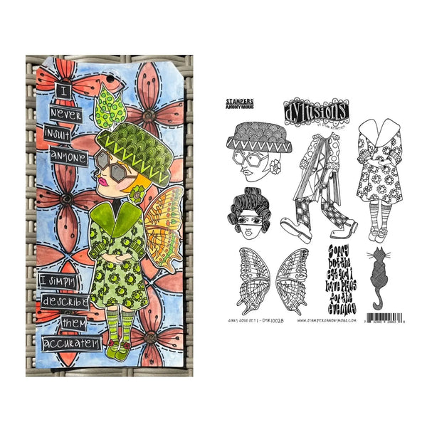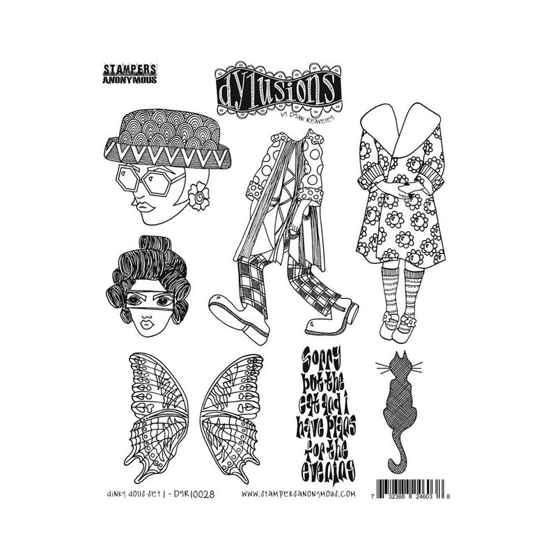 Dyan Reaveley's Dylusions Cling Stamp Collections 8.5"X7" - Dinky Dolls Set #1 - Add layers of creative design with Dylusions Cling Rubber Stamps. Use stamps for art journaling, mixed media projects, card making and more. Bring Dyan's fun and whimsical designs to life in your projects and mix with Dylusions Ink Sprays, Paints, Stencils & accessories (sold separately).This set includes deeply etched red rubber cling mount rubber stamps that adhere to any clear acrylic block (sold separately).