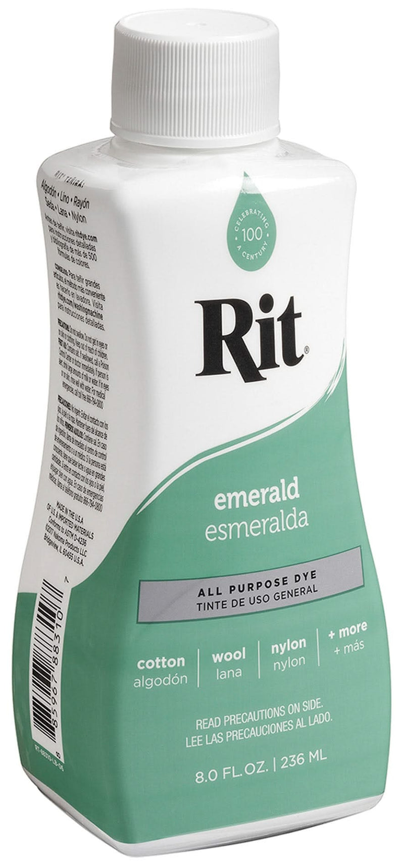 Rit Dye Liquid 8oz - Emerald - Dye clothing and accessories, rejuvenate old garments, coordinate home decor, hide laundry accidents and more. Pre-dissolved liquid is also great as a stain on unfinished wood and wicker, or use to stencil or antique. Works on silk & dried floral, nylon and plastic, or even golf balls. This package contains one 8oz bottle.