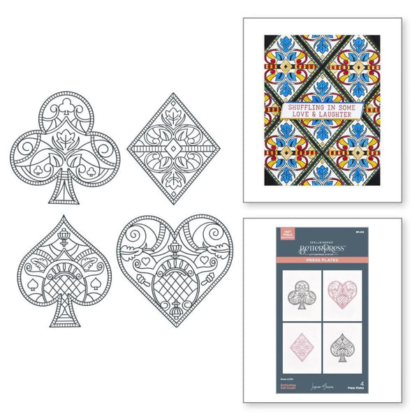 Spellbinders Better Press Plates By Jaycee Gaspar Enchanting Suit Facets - Enchanting Suit Facets Press Plates are part of the Jack of All Trades Collection by Jaycee Gaspar. This set of four plates features intricate designs for the Heart, Club, Spade, and Diamond, each measuring three inches tall. These ornate motifs are perfect for adding unique elements to your projects or personalizing playing cards. Ink the plates with BetterPress Ink to achieve a crisp letterpress design on BetterPress Cotton Card Panel and Sheets. Using the plates is simple and professional results are achieved in just four steps. Place the BetterPress Press Plate onto the Chase (a magnetic platform designed to hold the press plate). Tape the Card Panel onto the Platen (a clear top plate with registration marks), apply ink to the Press Plate, and then make a Letterpress Sandwich. Run it through a manual die-cutting machine to produce a beautiful, detailed impression with a tactile finish. Explore creative possibilities with this versatile set, whether for crafting unique stationery or experimenting with personalized card designs.