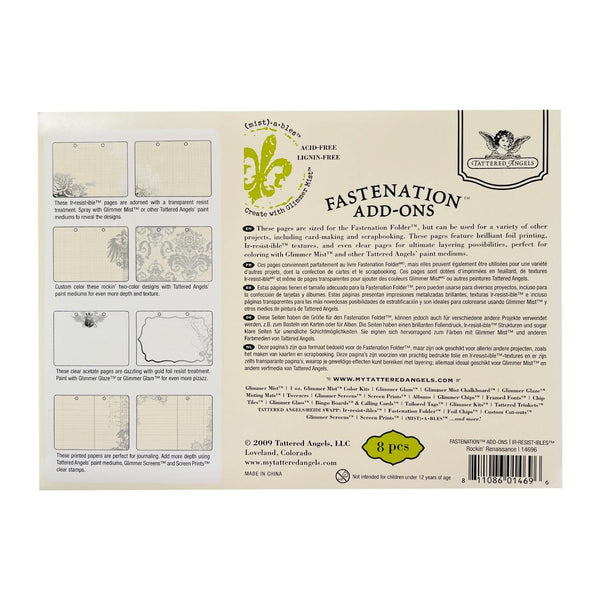 Tattered Angels Fastenation Add-Ons. Embellished with a unique design these Tattered Angels add-ons offer a stylish supplement for Fastenation folders and are perfect for card-making and scrapbooking projects too. This package contains eight acid and lignin free paper sheets Two (2) with transparent resist treatment Two (2) acetate sheets with gold resist foil Four (4) printed ivory sheets. Fastenations Folder not included (TA14689). Sheets measure 9 inches long x 6.5 inches wide - RRP $12.99.