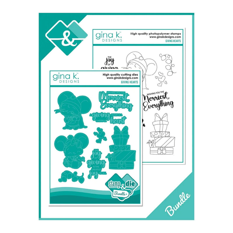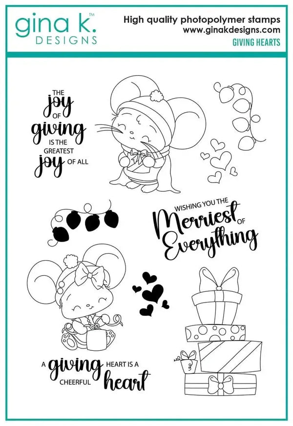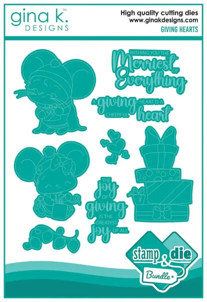 Gina K Designs Stamp & Die Set - Giving Hearts. Giving Hearts is a stamp set by Dina Gerner. This set is made of premium clear photopolymer and measures 6"x 8". Made in the USA