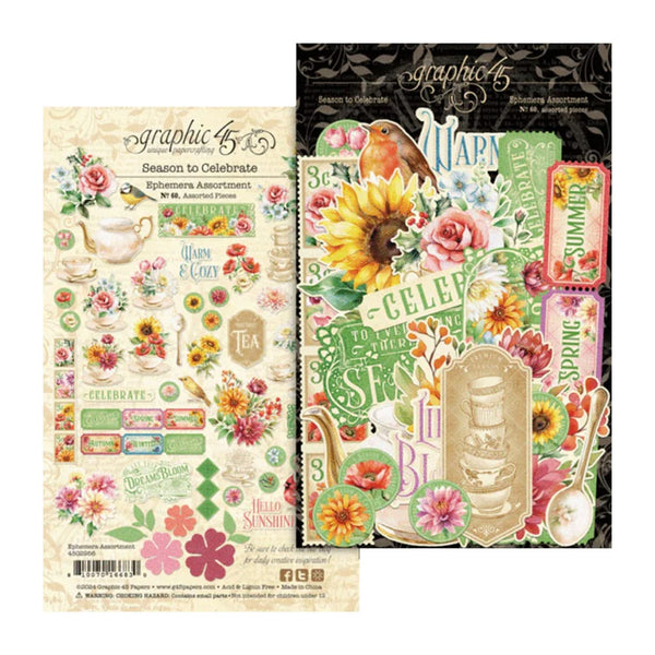 Graphic 45 Ephemera Set - Season To Celebrate. Season to Celebrate Paper Collection is a versatile and heartwarming tribute to the years most special moments. Brimming with timeless designs, this collection is filled with lush florals, cheerful birds, and festive elements that capture the essence of every season. From sun-kissed summer blooms to cozy winter gatherings, Season to Celebrate is perfect for year-round crafting. With soft pastels, rich autumn hues, and festive winter tones, Season to Celebrate is the perfect choice for crafting birthday cards, holiday decor, memory albums, and more. Whether for seasoned crafters or beginners, this collection offers endless possibilities for capturing the beauty of each season. This package contains approximately 60 ephemera pieces.