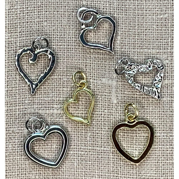 Jewlery Made by Me - Charms 6 pack Heart - Use these classic heart charms in your next DIY jewellery project. There are six charms in all, two in gold and four in silver and all are cut out in the center. One is silver with a slight texture in the metal, with a slight curved tail in the top center. Another is smooth silver with a smooth half circle of metal at the top. Another is silver with a heavily texture in the metal. Another is smooth gold that hangs at an angle from the top of one side of the heart. Another is smooth silver, classic heart. The last is a smoot gold classic heart. Perfect for jewellery, necklace, bracelet earrings and more! Use one or all to create to create a unique piece, designed by you!