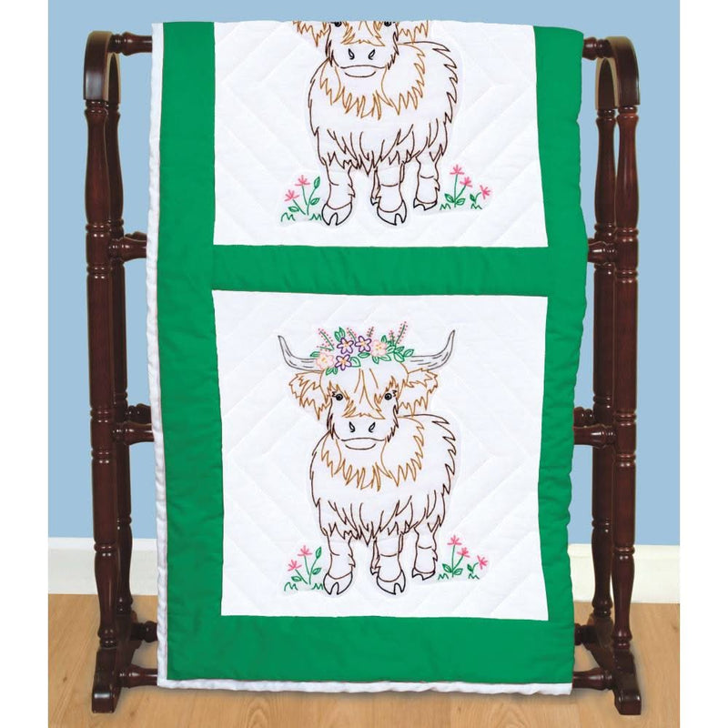 Jack Dempsey Stamped White Quilt Blocks 18"X18" 6/Pkg Highland Cow - Create a beautiful quilt top using this great kit. It consists of individual squares to stitch and join together to form a quilt top. The stitching designs have been stamped using ink that washes away with any liquid and the fabric is a cotton/poly blend broadcloth. This package contains six 18x18 inch quilt squares, instructions for completion and care and complete list of DMC floss requirements. Material for stripping, backing, batting, hoop, needle, thread and floss all sold separately. Design: Highland Cow. Made in the USA.