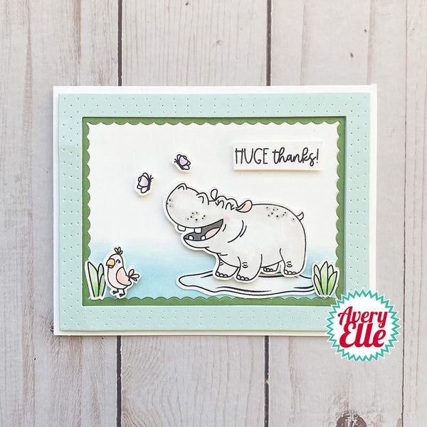 Avery Elle Clear Stamp Set 4"X3" (10.2cm x 7.6cm) - Hippo Hooray. This 11-piece clear photopolymer stamp set features a hippo, a puddle of water, a bird, butterflies, grass, a trail and three sentiments. These stamps adhere to acrylic blocks and can be used with your favourite inks, markers, embossing powders and other crafting mediums (sold separately). They can be used on cards, scrapbook pages, tags and other papercrafting projects. Sentiments include: this is HUGE!, HIP HIPPO HOORAY!, and HUGE thanks!. The hippo stamp measures 2.3125" x 1.75" (5.8cm x 4.4cm), the bird measures 0.5625" x 0.8125" (1.4cm x 2cm) and the hip, hippo, hooray sentiment measures 2.625" x 0.25" (6.6cm x 0.6cm). Made in the USA. Largest: 2.37" x 1.62" (6cm x 4.1cm). Smallest: 0.31" x 0.37" (0.7cm x 0.9cm).