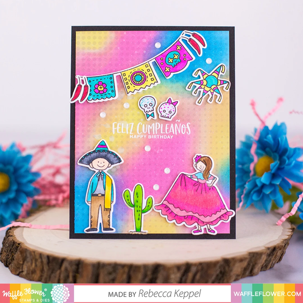 Waffle Flower Die - Hola Mexica - Hola! Mexico! This new addition to the Around the World Series has us thinking warm thoughts (and craving margaritas). Our favourite is the papel picado banners, and the little his and hers skulls for Día de los Muertos. Can’t you just hear those sweet mariachis playing a birthday song for a friend? This set includes 16 matching dies. As Shown on Die Preview Comes de-tabbed with magnetic storage sheet. Can be used in all leading desktop roller die-cut machines (sold separately).