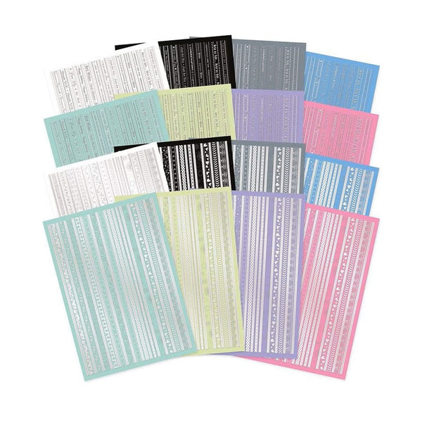 You'll find 2 different designs through this pack, each featuring 13 different individual border designs, foiled in Stunning Silver foiling onto 8 different colourways.