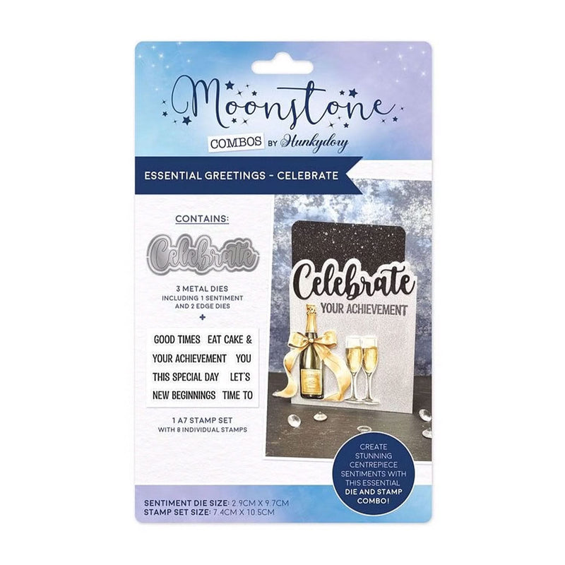 Hunkydory Moonstone Combos - Essential Greetings - Celebrate. The Moonstone Combos - Essential Greetings - Celebrate includes 3 metal dies and 8 individual stamps on an A7 sheet. The large centrepiece die features the word ‘Celebrate’ in a lovely, script font and can be used with the selection of sentiment and word stamps to create your own greetings including: ‘Celebrate good times’, ‘Celebrate new beginnings’, ‘Eat cake & celebrate’ and many more.
