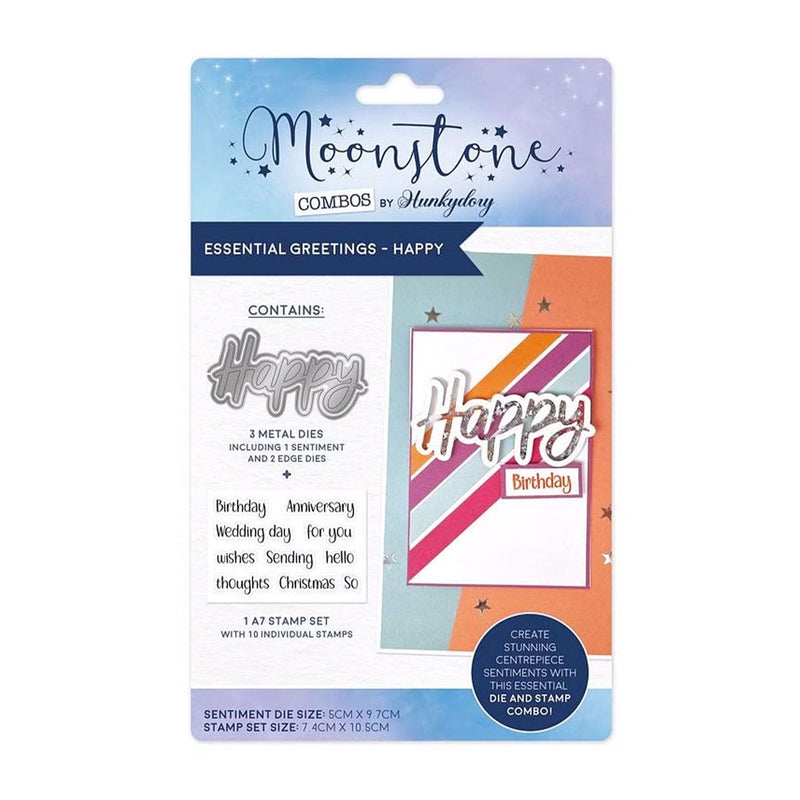 Hunkydory Moonstone Combos - Essential Greetings - Happy. The Moonstone Combos - Essential Greetings - Happy includes 3 metal dies and 10 individual stamps on an A7 sheet. The large centrepiece die features the word ‘Happy’ in a brush-style font and can be used with the selection of sentiment and word stamps to create your own greetings including: ‘Happy Birthday’, ‘Happy Anniversary’, ‘So Happy for you’ and many more.
