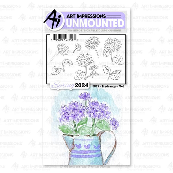 Art Impressions Watercolour Cling Rubber Stamps Hydrangea - Create beautiful floral designs with the Hydrangea Repositionable Unmounted Rubber Stamps from Art Impressions. These unmounted stamps offer ultimate flexibility, allowing you to position and reposition them on acrylic blocks for precise placement (sold separately). With seven different pieces featuring delicate hydrangea flowers, you'll have endless creative possibilities at your fingertips. Use these stamps with your favouritr inks, markers, watercolours, coloured pencils, and other crafting mediums (all sold separately) to bring your artistic vision to life. From handmade cards to scrapbook pages, these stamps will add a touch of elegance to any project. The dimensions range from the smallest stamp measuring .6" x .4" to the largest measuring 1.3" x 1.1". Elevate your crafting experience with the Hydrangea Repositionable Unmounted Rubber Stamps.