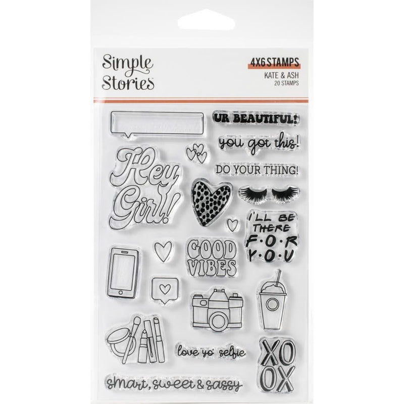 Simple Stories - Kate & Ash Photopolymer Clear Stamps - Add wonderful images and phrases to cards and more with these clear stamps! This package contains Kate & Ash: a set of 20 stamps on a 4x6 inch backing sheet.
